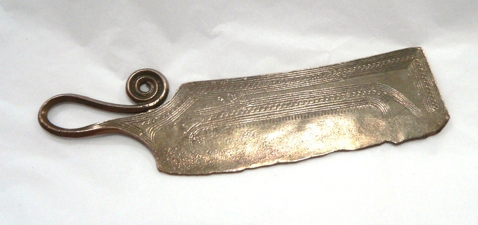The original shows chased decoration in the stylised form of a ship. It is from Voldtofte, South-West Funen. 8th century BC. Odense Bys Museer, Denmark. Length 120mm.