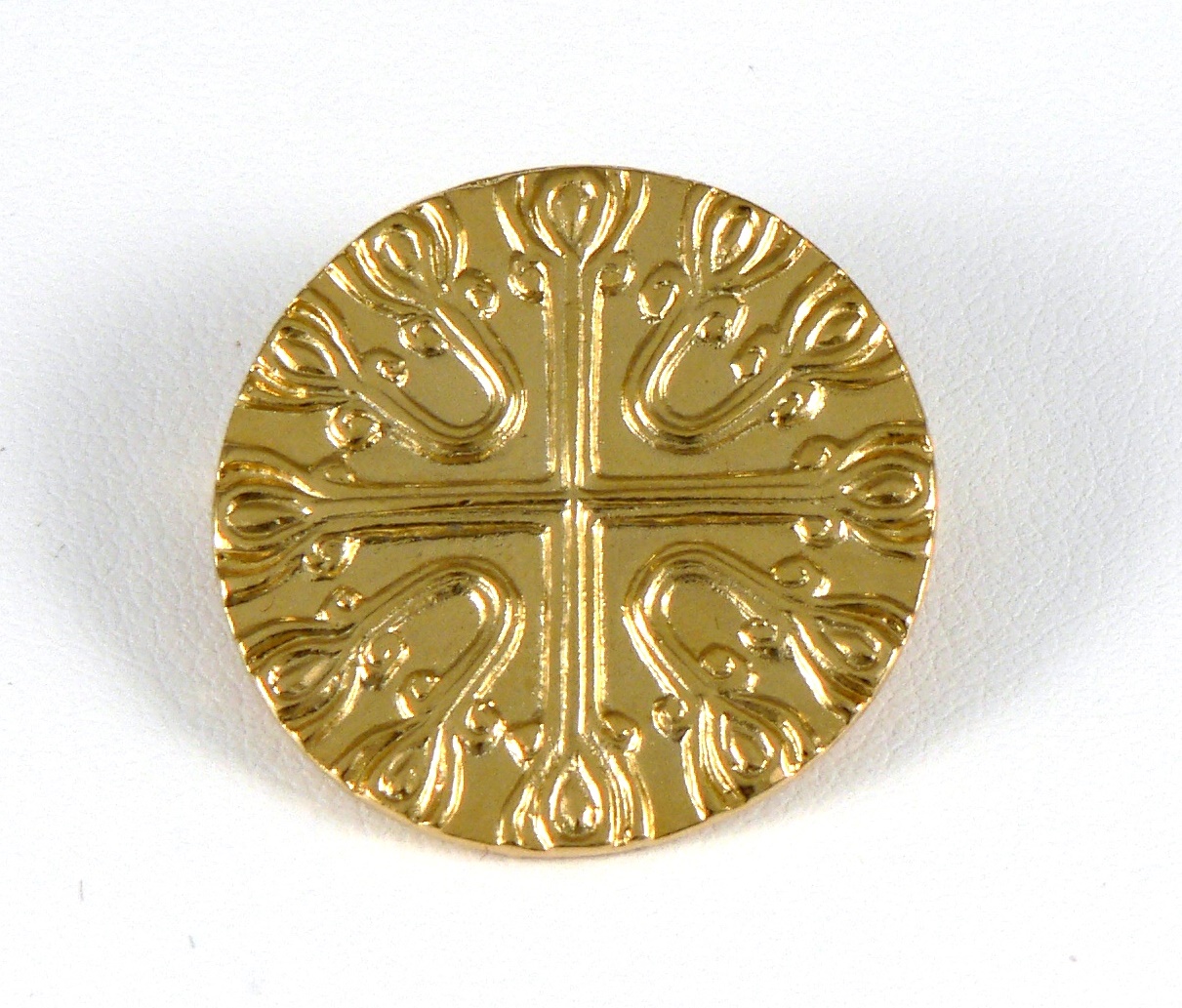 The original from early 13th century AD, sculpted decoration on a tomb in the Church of St. Chad may be seen at the Parish Church of the Holy Cross, Shrewsbury, Shropshire. Gilded English Pewter. Diameter 27mm.